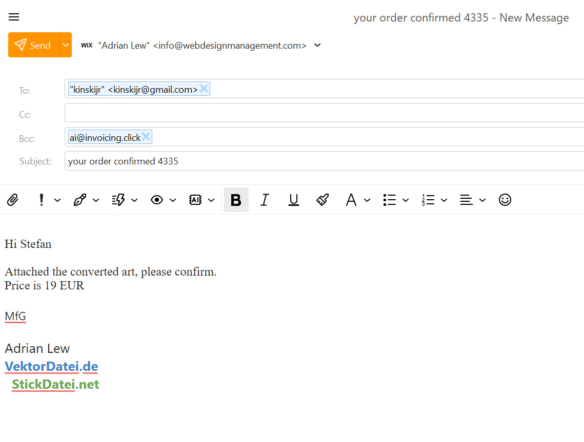 Send order confirmation to your client or finish product perfect for digital art or files. BBC ( ai@invoicing.click ) and our system will start adding orders from this client to your invoice !